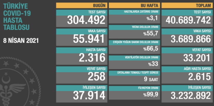 Toplam vaka sayısının 3 milyon 689 bin 866 olduğu, bugün iyileşen 37 bin 914 kişiyle birlikte toplam iyileşen hasta sayısının 3 milyon 232 bin 892'e yükseldiği, toplam hastalarda zatürre oranının yüzde 3,1, ağır hasta sayısının ise 2 bin 615 olduğu açıklandı.