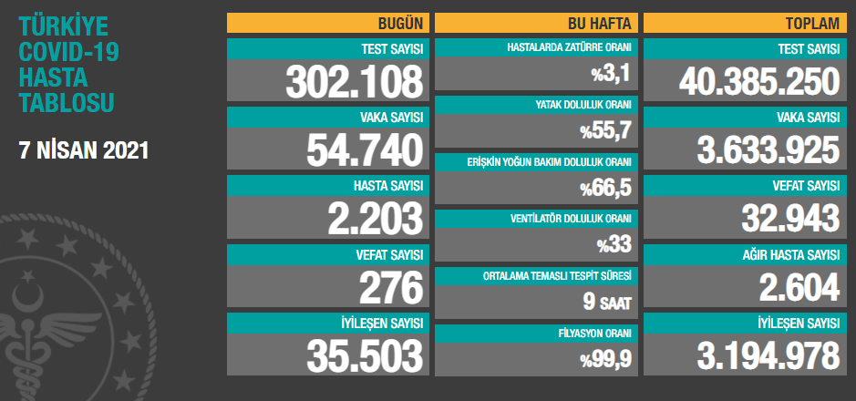 Toplam vaka sayısının 3 milyon 633 bin 925 olduğu, bugün iyileşen 35 bin 503 kişiyle birlikte toplam iyileşen hasta sayısının 3 milyon 194 bin 978'e yükseldiği, toplam hastalarda zatürre oranının yüzde 3,1, ağır hasta sayısının ise 2 bin 604 olduğu açıklandı.